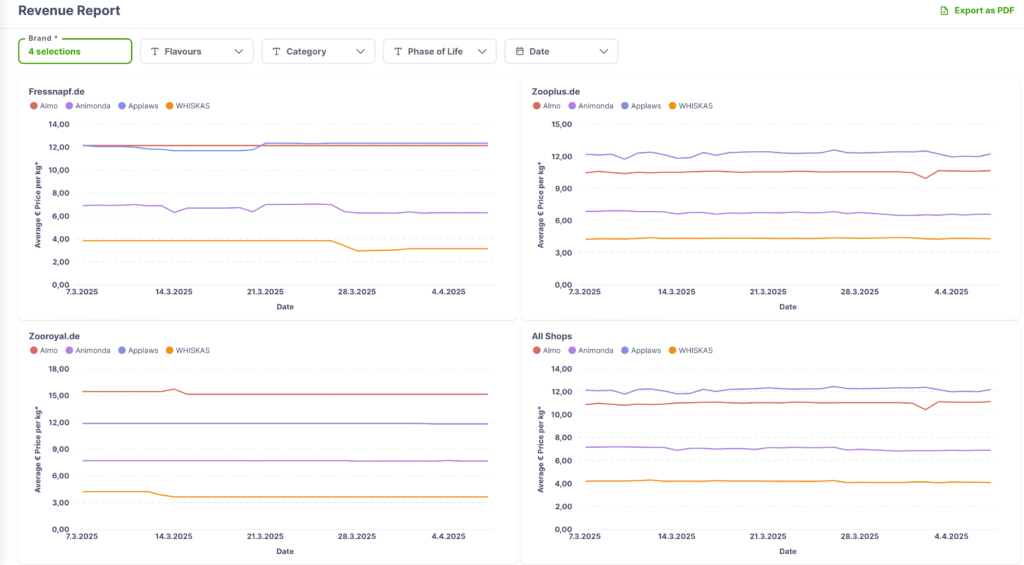 On paper, our product prices were well-calculated—but the market had moved on. Major platforms like Fressnapf, Zooplus, and Zooroyal were offering comparable products at significantly lower prices. And because we didn’t have a structured overview of pet food price comparison across the market, we noticed the shift far too late.