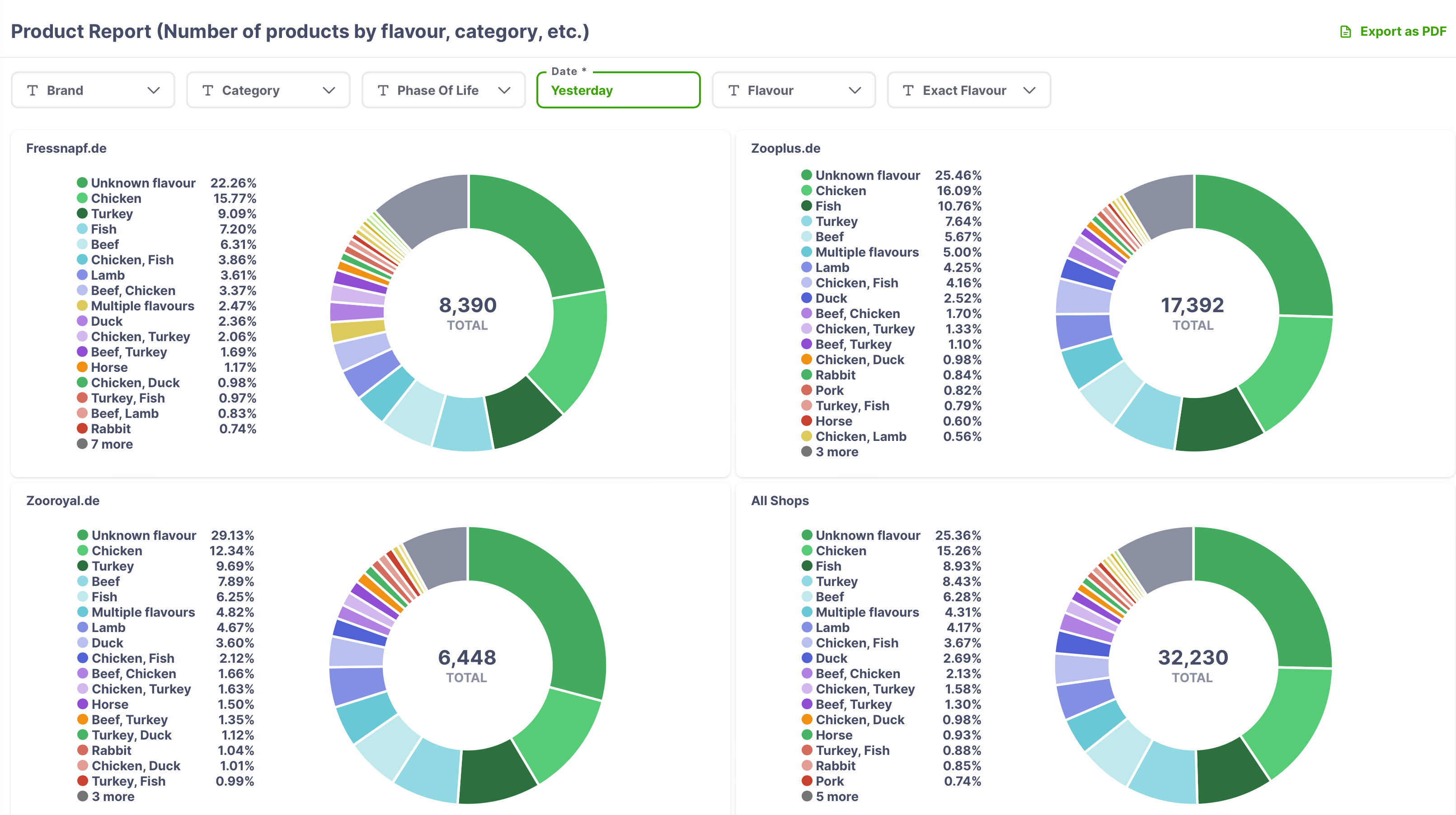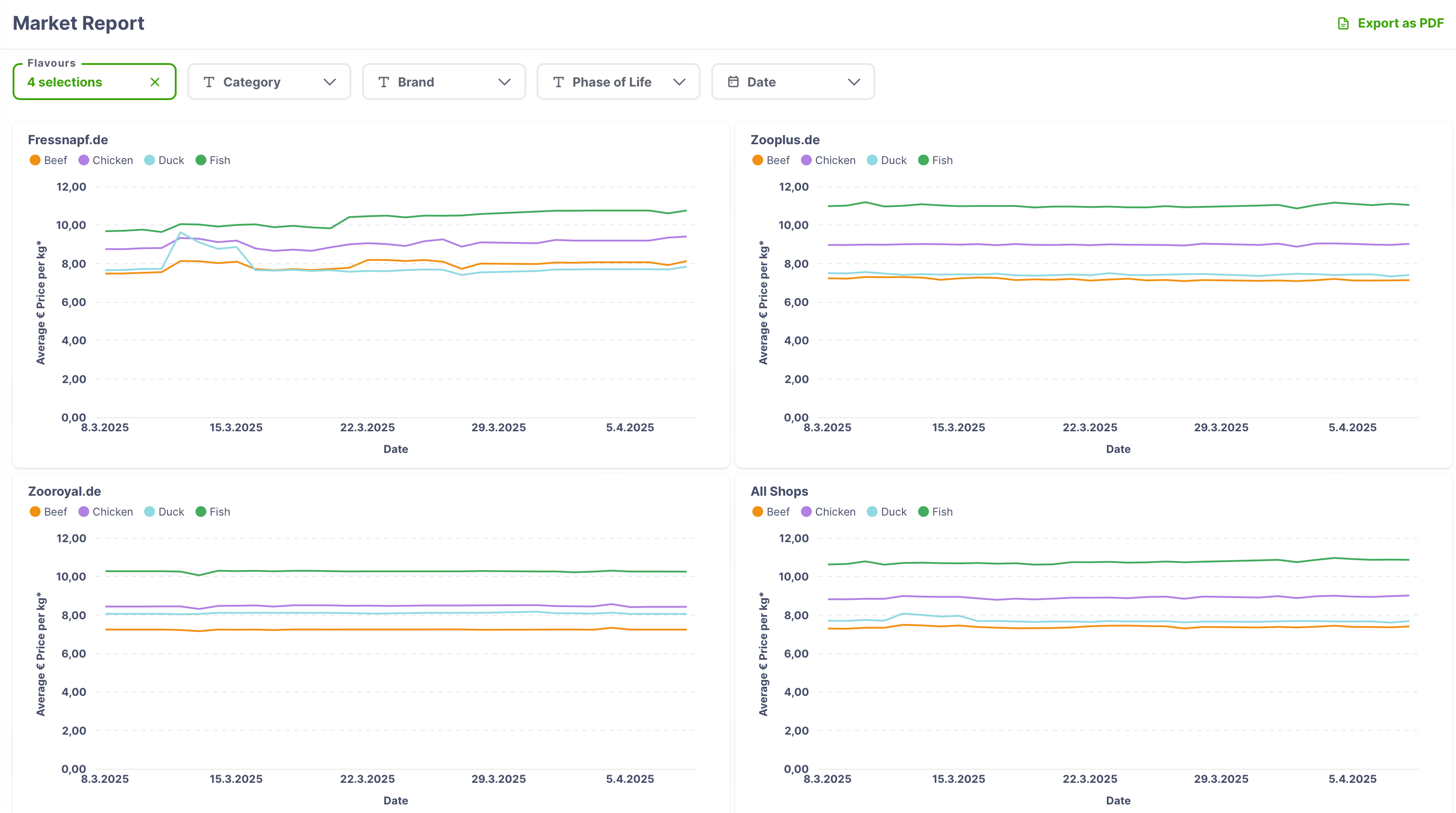 Compare duck to chicken, cat to dog – brand by brand, shop by shop. The Market Report gives you a high-level view of pricing trends across brands, flavours and categories. Analyze how different product types perform by retailer, track price movements over time, and uncover patterns that drive smarter product and pricing strategies. It’s your shortcut to understanding the pet food market at scale.
