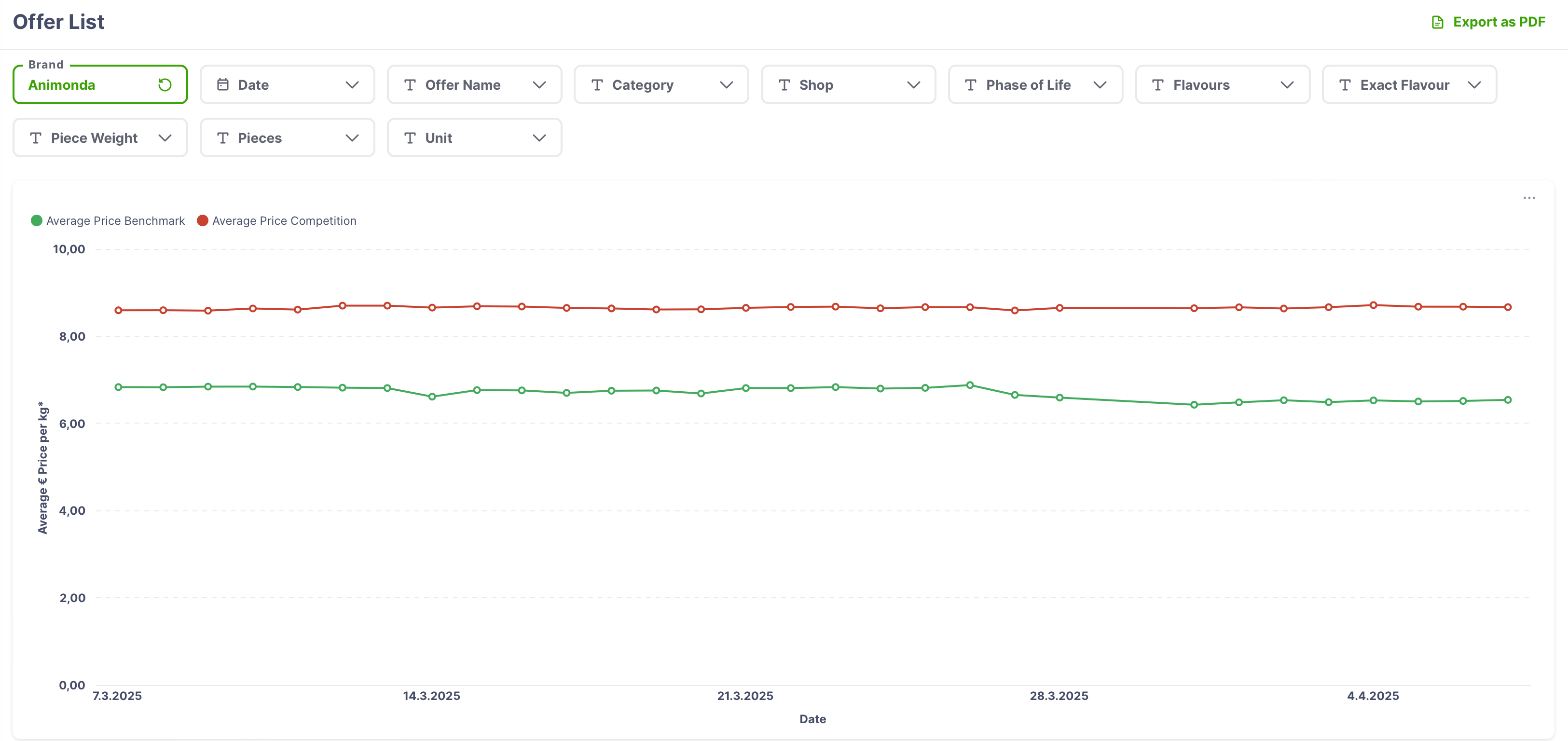 Find out how your brand is being sold compared to your biggest competitors. The Offer List gives you a clear, searchable view of every live product listing — including sales price, flavour, and category. Track your product across leading online retailers, compare offers side-by-side with competitors, and identify gaps or opportunities in real time. It’s the foundation of effective pet food price monitoring.