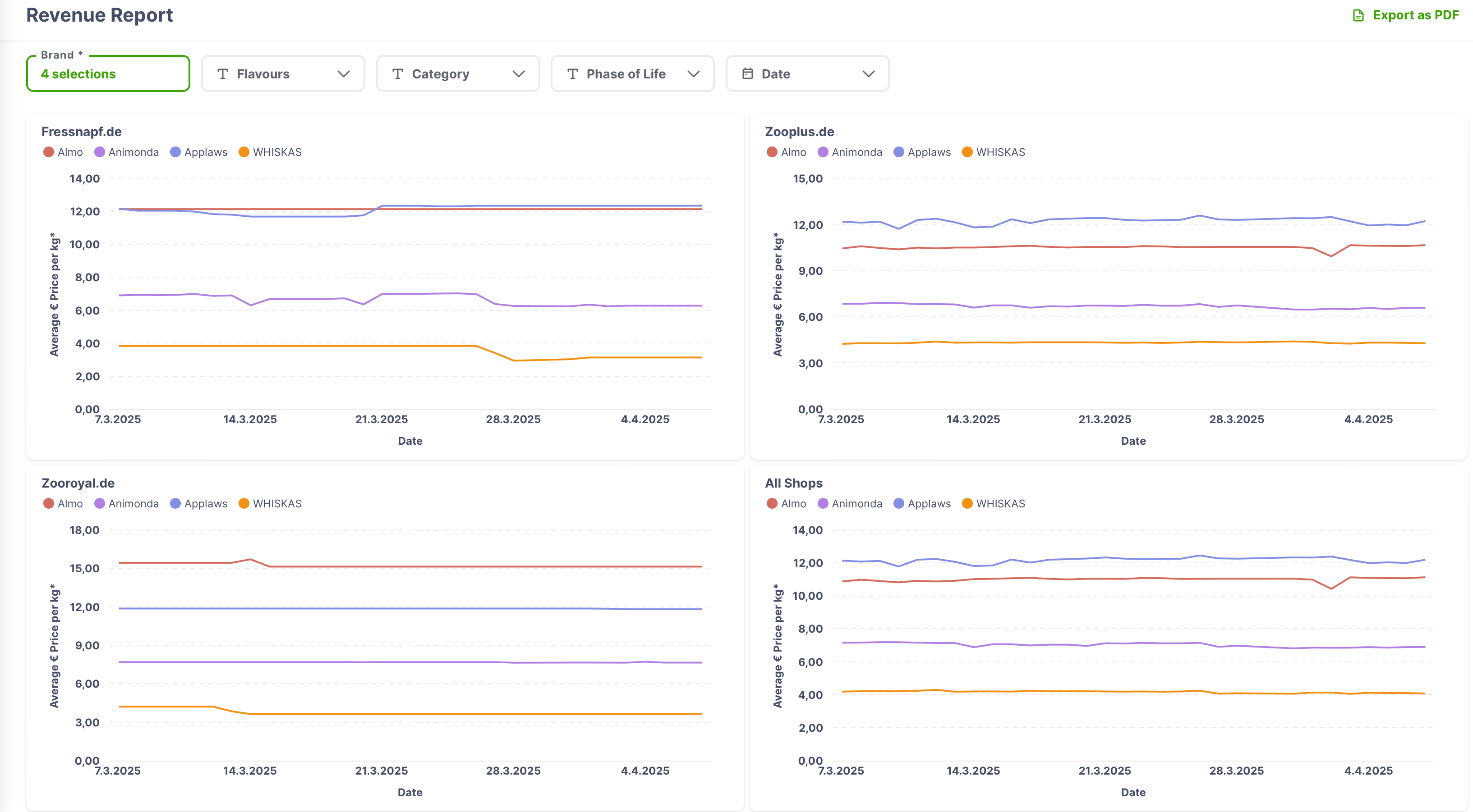 PetFood Index provides daily pet food price comparison and real-time pricing insights from Germany’s leading online retailers – Zooplus, Fressnapf, and Zooroyal – helping pet food businesses make smarter, data-driven decisions.